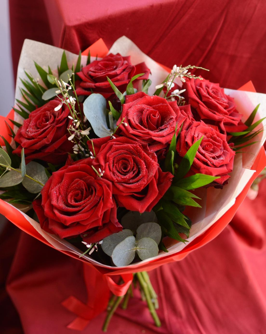 Contine 7 trandafiri rosii, verdeata, ambalaj.